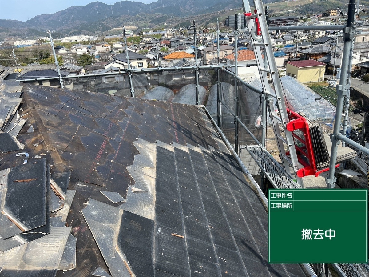 既存のスレート屋根を一枚ずつ丁寧に撤去します。