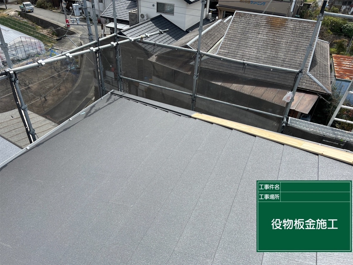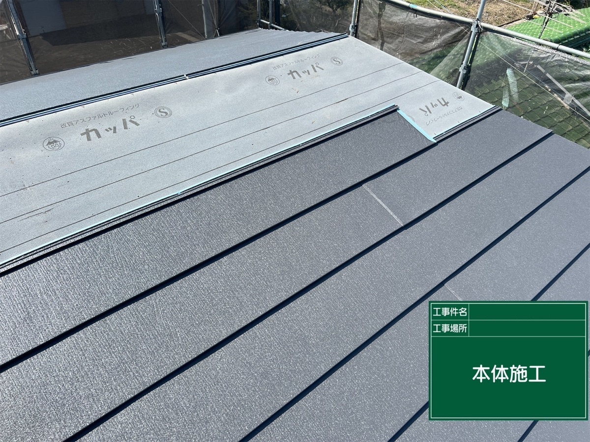 一番のメリットは、なんといっても「軽さ」。瓦やスレートに比べて驚くほど軽いので、建物全体への負担が減り、地震の揺れにも強い家になります。一枚ずつしっかり固定して、きれいに仕上げていきます。